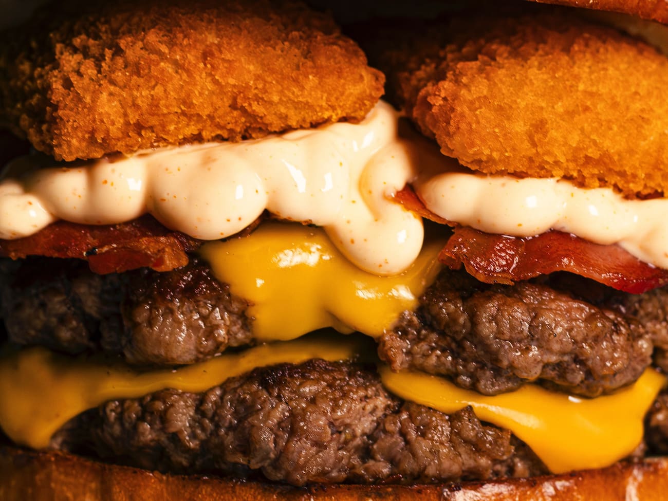 Pão brioche, burger artesanal bovino, cheddar fatiado, almofadinhas de queijo gouda empanado, maionese defumada e bacon.