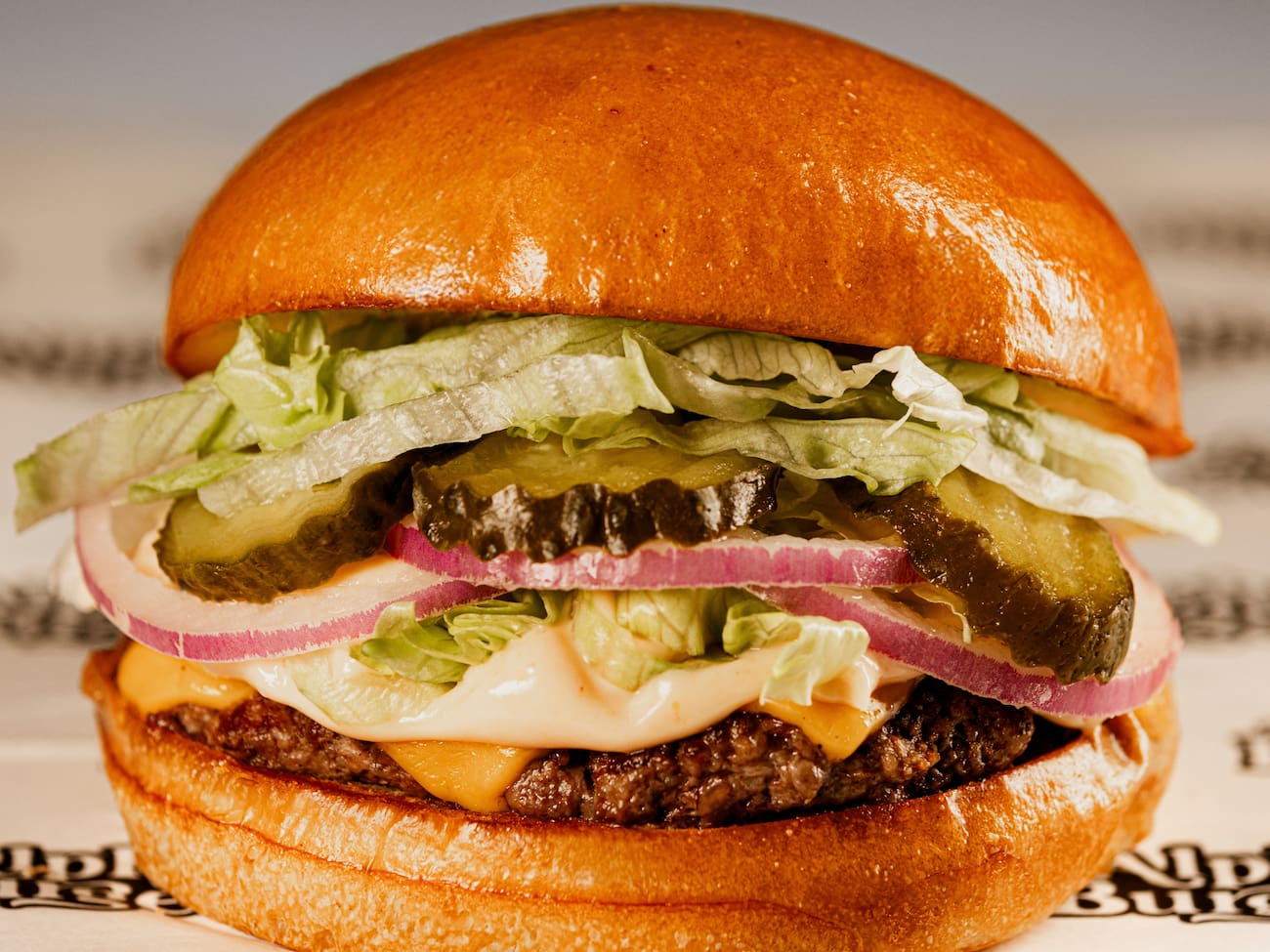 Pão brioche, burger artesanal bovino, cheddar fatiado, alface, picles de pepino, cebola roxa e molho Alpha.